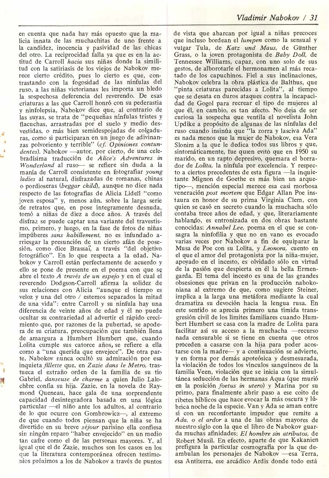 en cuenta que nada hay más opuesto que la malicia innata de las muchachitas de uno frente a la candidez, inocencia y pasividad de las chicas del otro. La reciprocidad falla ya que es en la actitud de Carroll hacia sus niñas donde la similitud con la satiriasis de los viejos de Nabokov merece cierto crédito, pues lo cierto es que, contrastando con la fogosidad de las nínfulas del ruso, a las niñas victorianas les importa un bledo la sospechosa deferencia del reverendo. De esas criaturas a las que Carroll honró con su pederastia y ninfolepsia, Nabokov dice que, al contrario de las suyas, se trata de "pequeñas nínfulas tristes y flacuchas, arrastradas por el suelo y medio desvestidas, o más bien semidespojadas de colgaduras, como si participaran en un juego de adivinanzas polvoriento y terrible" (cf. Opiniones contundentes). Nabokov —autor, por cierto, de una celebradísima traducción de Alice's Adventures in Wonderland al ruso— se refiere sin duda a la manía de Carroll consistente en fotografiar young ladies al natural, disfrazadas de romanas, chinas o pordioseras (beggar child), aunque no dice nada respecto de las fotografías de Alicia Lidell "como joven esposa" y, menos aún, sobre la larga serie de retratos que, en pose íntegramente desnuda, tomó a niñas de diez a doce años. A través del disfraz se puede captar una variante del travestismo, primero, y luego, en la fase de fotos de niñas impúberes sans habillement, no es infundado arriesgar la presunción de un cierto afán de posesión, como dice Brassai, a través "del objetivo fotográfico". En lo que respecta a la edad: Nabokov y Carroll están perfectamente de acuerdo y ello se pone de presente en el poema con que se abre el texto A través de un espejo y en el cual el reverendo Dodgson-Carroll afirma la solidez de sus relaciones con Alicia "aunque el tiempo es veloz y una del otro / estemos separados la mitad de una vida": entre Carroll y su nínfula hay una diferencia de veinte años de edad y él no puede ocultar su contrariedad al advertir el rápido crecimiento que, por razones de la pubertad, se apodera de su criatura, preocupación que también llena de amargura a Humbert Humbert que, cuando Lolita cumple sus catorce años, se refiere a ella como a "una querida que envejece". De otra parte, Nabokov nunca ocultó su admiración por esa inquieta fillette que, en Zazie dans le Metro, trastueca el extraño orden de la familia de su tío Gabriel, danseuse de charme a quien Julio Lalochère confía su hija. Zazie, en la novela de Raymond Queneau, hace gala de una sorprendente capacidad desintegradora basada en una lógica particular —el niño ante los adultos, al contrario de lo que ocurre con Gombrowicz—, al extremo de que cuando todos piensan que la niña se ha divertido en su breve séjour parisino ella confiesa sin ningún reparo "haber envejecido" en un medio tan cafre como el de las personas mayores. Y, al igual que el de Zazie, muchos son los casos en los que la literatura contemporánea ofrecen testimonios próximos a los de Nabokov a través de puntos de vista que abarcan por igual a niñas precoces que incluso bordean el lumpen como la sensual y vulgar Tula, de Katz und Maus, de Günther Grass, o la joven protagonista de Baby Doll, de Tennessee Williams, capaz, con uno solo de sus gestos, de alborotarle el hermonamen al más recatado de los capuchinos. Fiel a sus inclinaciones, Nabokov celebra la obra plástica de Balthus, que "pinta criaturas parecidas a Lolita", al tiempo que se desata en duros ataques contra la incapacidad de Gogol para recrear el tipo de mujeres al que él, en cambio, es tan afecto. No deja de ser curiosa la sospecha que ventila el novelista John Updike a propósito de algunas de las nínfulas del ruso cuando insinúa que "la zorra y lasciva Ada" es nada menos que la mujer de Nabokov, esa Vera Slonim a la que le dedica todos sus libros y que, sintomáticamente, fue quien evitó que en 1950 su marido, en un rapto depresivo, quemara el borrador de Lolita, la nínfula por excelencia. Y respecto a ciertos precedentes de esta figura —la inquietante Mignon de Goethe es más bien un arquetipo—, mención especial merece esa casi morbosa veneración post mortem que Edgar Allan Poe instaura en honor de su prima Virginia Clem, con quien se casó en secreto cuando la muchacha sólo contaba trece años de edad, y que, literariamente hablando, es entronizada en dos obras bastante conocidas: Annabel Lee, poema en el que se consagra la ninfofilia y que no en vano es evocado varias veces por Nabokov a fin de equiparar la Musa de Poe con su Lolita, y Leonora, cuento en el que el amor del protagonista por la niña-mujer, apoyado en el incesto, es olvidado sólo en virtud de la pasión que despierta en él la bella Ermengarda. El tema del incesto es una de las grandes obsesiones que privan en la producción nabokoniana al extremo de que, como sugiere Steiner, implica a la larga una metáfora mediante la cual dramatiza su devoción hacia la lengua rusa. En este sentido se aprecia primero una tímida transgresión civil de los limites familiares cuando Humbert Humbert se casa con la madre de Lolita para facilitar así su acceso a la muchacha —recurso nada censurable si se tiene en cuenta que otros proceden a casarse con la hija para poder acostarse con la madre— y a continuación se advierte, y en forma por demás apoteósica y desmesurada, la violación de todos los vínculos sanguíneos de la familia Veen, violación que se inicia con la simultánea seducción de las hermanas Aqua (que murió en la posición foetus in utero) y Marina por su primo, para finalmente abrir paso a ese coito de ribetes bíblicos que hace evocar la más oscura y lúbrica noche de la especie. Van y Ada se aman entre sí con un reconfortante impudor que remite a Ada, o el ardor a una de las obras mayores de nuestro siglo con la que el libro de Nabokov guarda muchas afinidades: El hombre sin atributos, de Robert 
