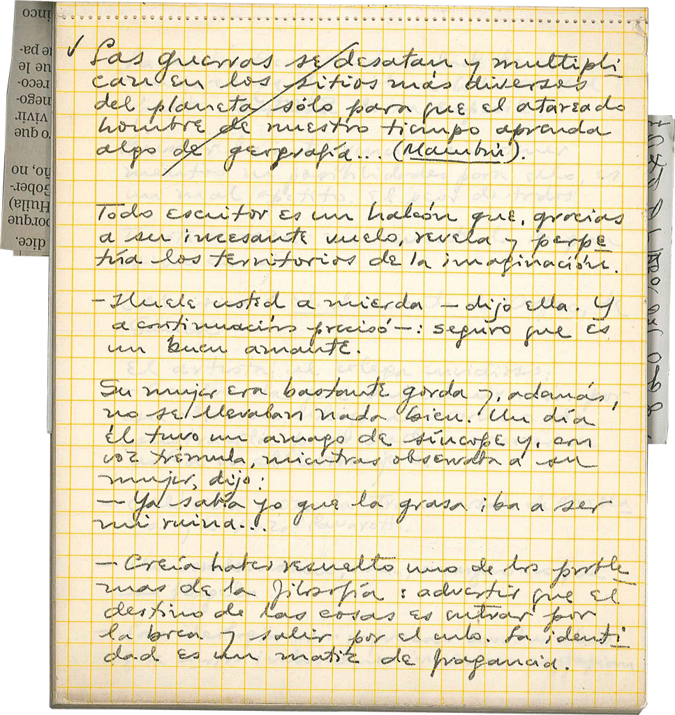 ✓ <Las guerras se desatan y multipli-|can en los sitios más diversos | del planeta sólo para que el atareado | hombre de nuestro tiempo aprenda | algo de geografía… (Mambrú)1.> Todo escritor es un halcón que, gracias | a su incesante vuelo, revela y perpe-|túa los territorios de la imaginación. —Huele usted a mierda —dijo ella. Y | a continuación precisó—: seguro que es | un buen amante. Su mujer era bastante gorda y, además, | no se llevaban nada bien. Un día | él tuvo un amago de síncope y, con | voz trémula, mientras observaba a su | mujer, dijo: —Ya sabía yo que la grasa iba a ser mi ruina… —Creía haber resuelto uno de los proble| mas de la filosofía: advertir que el | destino de las cosas es entrar por | la boca y salir por el culo. La identi-|dad es un matiz de fragancia. 1 El autor deja a la izquierda un visto y tacha el segmento inicial con una línea transversal. Al final del párrafo pone entre paréntesis Mambrú. ✓ Las guerras se desatan y multiplican en los sitios más diversos del planeta sólo para que el atareado hombre de nuestro tiempo aprenda algo de geografía… (Mambrú) 1. Todo escritor es un htalcón que, gracias a su incesante vuelo, revela y perpetúa los territorios de la imaginación. —Huele usted a mierda—dijo ella. Y a continuación precisó—: seguro que es un buen amante. Su mujer era bastante gorda y, además, no se llevaban nada bien. Un día él tuvo un amago de síncope y, con voz trémula, mientras observaba a su mujer, dijo: —Ya sabía yo que la grasa iba a ser mi ruina… —Creía haber resuelto uno de los problemas de la filosofía: advertir que el destino de las cosas es entrar por la boca y salir por el culo. La identidad es un matiz de fragancia. 1Mambrú (1996) es una novela de Moreno-Durán que habla acerca de la participación que tuvo el ejército colombiano en la guerra de Corea.