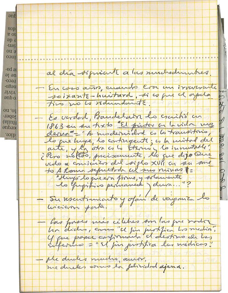 —Es verdad, Baudelaire lo escribió en 1863 en | su texto <“>El pintor en la vida moderna<”>: “La modernidad es lo transitorio, | lo que huye, lo contingente; es la mitad del | arte, y la otra es lo eterno y lo inmutable”. | ¿Pero no [↑ fue] eso, precisamente, lo que dijo Que-|vedo a comienzos del siglo XVII en su sone-|to A Roma sepultada en sus ruinas<?>: