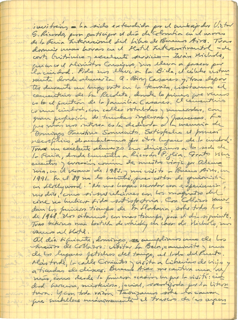 invitación <n> ha sido extendida por el embajador Victor | G. Ricardo, para participar el día de Colombia en el marco | de la Feria Internacional del Libro de Buenos Aires. Tras | dormir mas horas en el Hotel Intercontinental —de | corte británico y excelente servicio— Iván Nichols,7 | quien es el Ministro Consejero, nos lleva a pasear por | la ciudad. Pido nos lleve a La Vida, el célebre restaur-|rante donde almuerza A. Bioy Casares y, tras depar-|tir durante un largo rato en la terraza, visitamos el | cementerio de La Recoleta, donde lo primero que vemos | es <la> el panteón de la familia Casares. El cementerio | es una ciudad, con calles rotuladas y numeradas, con | gran profusión de tumbas inglesas y francesas. Lo | que más nos interesa es la dedicada a la memoria de | Domingo Faustino Sarmiento. Satisfecho el frenesí | necrofílico, deambulamos por otros lugares de la ciudad. | Tra<n>/s\ un excelente almuerzo nos dirigimos a la sede de | la Feria, donde encuentro a Ricardo Piglia. Grato reen-|cuentro y evocación común de nuestro viaje por Alema-|nia, en el verano de 1985, y mi visita a Buenos Aires, en | 1991. En el 89 no lo encontré, pues estaba de guionista | en Hollywood. “No me hagas recordar esa experiencia”, | me dice, como si sus relaciones con los magnates del | cine no hubiera sido satisfactoria. Con Collazos recuer-|dan los primeros tiempos de La Habana, sobre todo los | de 1968. Nos citamos, con más tiempo, para el día siguiente. | Tras bebernos una botella de whisky en casa de Nichols, nos | vamos al Hotel.