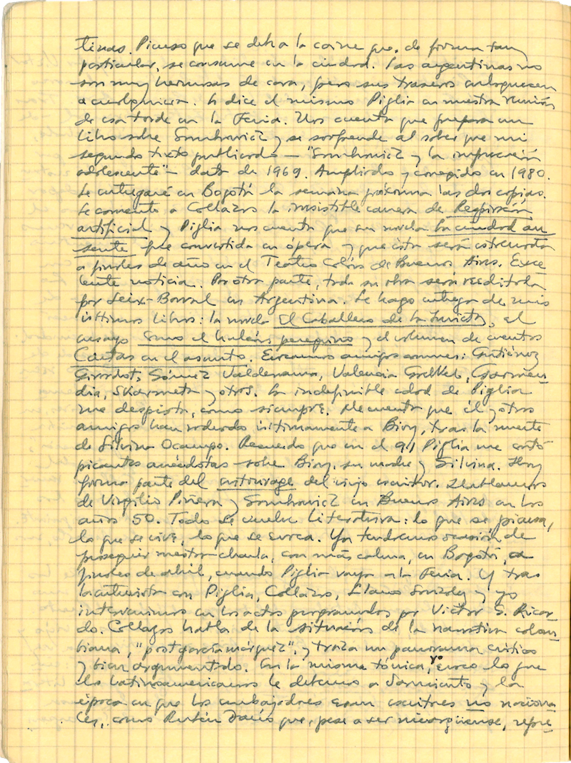 tinas. Pienso que se debe a la carne que, de forma tan | particular, se consume en la ciudad. Las argentinas no | son muy hermosas de cara, pero sus traseros enloquecen | a cualquiera. Lo dice el mismo Piglia en nuestra reunión de esa tarde en la Feria. Nos cuenta que prepara un | libro sobre Gombrowicz y se sorprende al saber que mi | segundo texto publicado —“Gombrowicz y la inspección | adolescente”— data de 1969. Ampliado y corregido en 1980. | Le entregaré en Bogotá la semana próxima las dos copias. | Le comento a Collazos la irresistible carrera de Respiración | Artificial y Piglia nos cuenta que su novela La ciudad au-|sente fue convertida en ópera y que ésta será estrenada | a finales del año en el Teatro Colón de Buenos Aires. Exce-|lente noticia. Por otra parte, toda su obra será reeditada | por Seix-Barral en Argentina. Le hago entrega de mis últimos libros: la novela El Caballero de la Invicta, el | ensayo Como el halcón peregrino y el volumen de cuentos | Cartas en el asunto. Evocamos amigos comunes: Gutiérrez | Girardot, Gómez Valderrama, Valencia Goelkel, Garmen-|dia, Skármeta y otros. La indefinible edad de Piglia | me despista, como siempre. Me cuenta que él y otros | amigos han rodeado últimamente a Bioy, tras la muerte | de Silvina Ocampo. Recuerdo que en el 91 Piglia me contó | picantes anécdotas sobre Bioy, su madre y Silvina. Hoy | forma parte del entourage del viejo escritor. Hablamos | de Virgilio Piñera y Gombrowicz en Buenos Aires en los | años 50. Todo se vuelve literatura: lo que se piensa, lo que se vive, lo que se evoca. Ya tendremos ocasión de | proseguir nuestra charla, con más calma, en Bogotá, <en>/a\ | finales de abril, cuando Piglia vaya a la Feria. Y tras | la entrevista con Piglia, Collazos, Llano Gonzáles y yo | intervenimos en los actos programados por Victor G. Ricar-|do. Collazos habla de la situación de la narrativa colom-|biana, “post garcía márquez", y traza un panorama crítico | y bien argumentado. En la misma tónica, [↑ yo] evoco lo que | los latinoamericanos le debemos a Sarmiento y la | época en que los embajadores eran escritores no naciona-|les, como Ruben Darío, que, pese a ser nicaragüense, repre