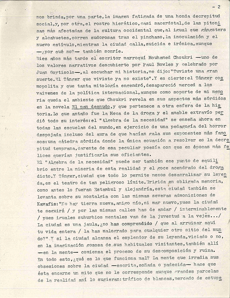 El “Algebra de la necesidad” puede ser también ese punto de equili-|brio entre la miseria de esta realidad y el goce acendrado del droga-|dicto. Y Tánger, ciudad que todo lo permite menos desacralizar su leyen-|da, es el teatro de tan peligroso límite. Erigida en obligada memoria, | como antes lo fueran Estambul y Alejandría, esta ciudad también se | levanta sobre su nostalgia con las mismas severas admoniciones de | Kavafis: “No hay tierra nueva, amigo mío, ni mar nuevo, pues la ciudad | te seguirá / y por las mismas calles has de andar / interminablemente | / pues iguales suburbios mentales van de la juventud a la vejez…/ | La ciudad es una jaula, ¿no has comprendido / que al arruinar aquí | tu vida entera / la has malogrado para cualquier otro sitio del mun-|do?” Y si la ciudad alcanza el esplendor de su leyenda, viciado o no, | en la imaginación gozosa de sus habituales visitantes, también allí | —en la mente— comienza el proceso de su descomposición y ruina. | En todo esto, ¿qué es lo que funciona mal? La mente que irradia sus | obsesiones sobre la ciudad —escrita, soñada o padecida— hace que | ésta encarne un mito que no le corresponde aunque grandes parcelas | de la realidad así lo sugieran: tráfico de blancas, mercado de estupe-